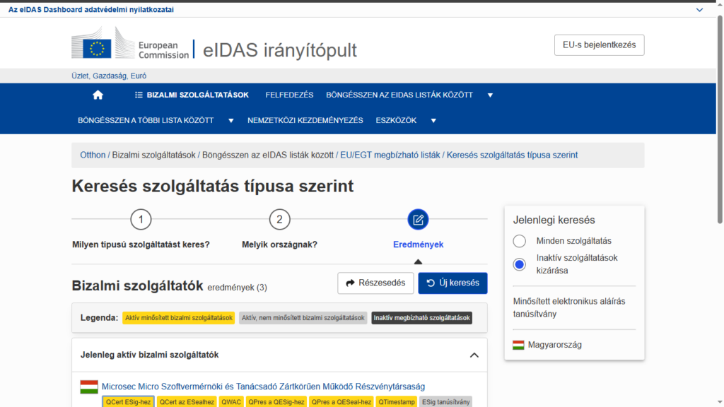 A minősített vagy minősített tanúsítványon alapuló fokozott biztonságú elektronikus aláírás alatt értjük az NMHH által minősített bizalmi szolgáltatók által biztosított elektronikus aláírásokat (https://esign.nmhh.hu/bszny/szolgParams/main.do), vagy az Európai Unióban működő bizalmi szolgáltatók által kibocsátott tanúsítványt, amennyiben a szolgáltató szerepel a (https://eidas.ec.europa.eu/efda/trust-services/browse/eidas/tls) listán.